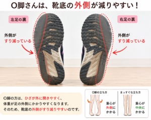 O脚さんはひざが外に開きやすく、足の重心も外側にのりやすいです。